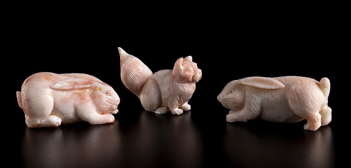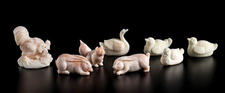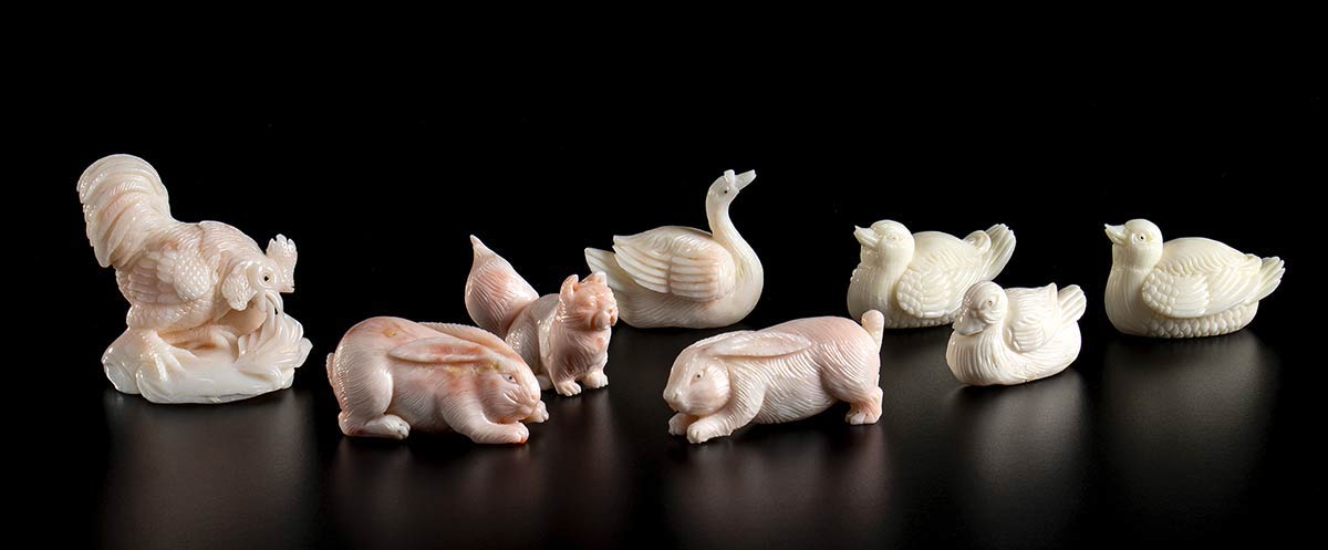 (corallium konjoi e corallium elatius) raffiguranti animali da cortile. Dimensioni 5,2 x 5,2 x 2,6 cm; 2,4 x 4,2 x 2,6 cm; 2,2 x 5 x 1,8 cm; 3 x 4,3 x 1,8 cm; 2,5 x 4,4 x 2,6 cm; 2,3 x 3,4 x 1,7 cm; 2,7 x 4,2 x 2,5 cm; 3,7 x 4,3 x 2,2 cm. Peso complessivo 233,9 gr. Stato di conservazione: ***** eccellente.