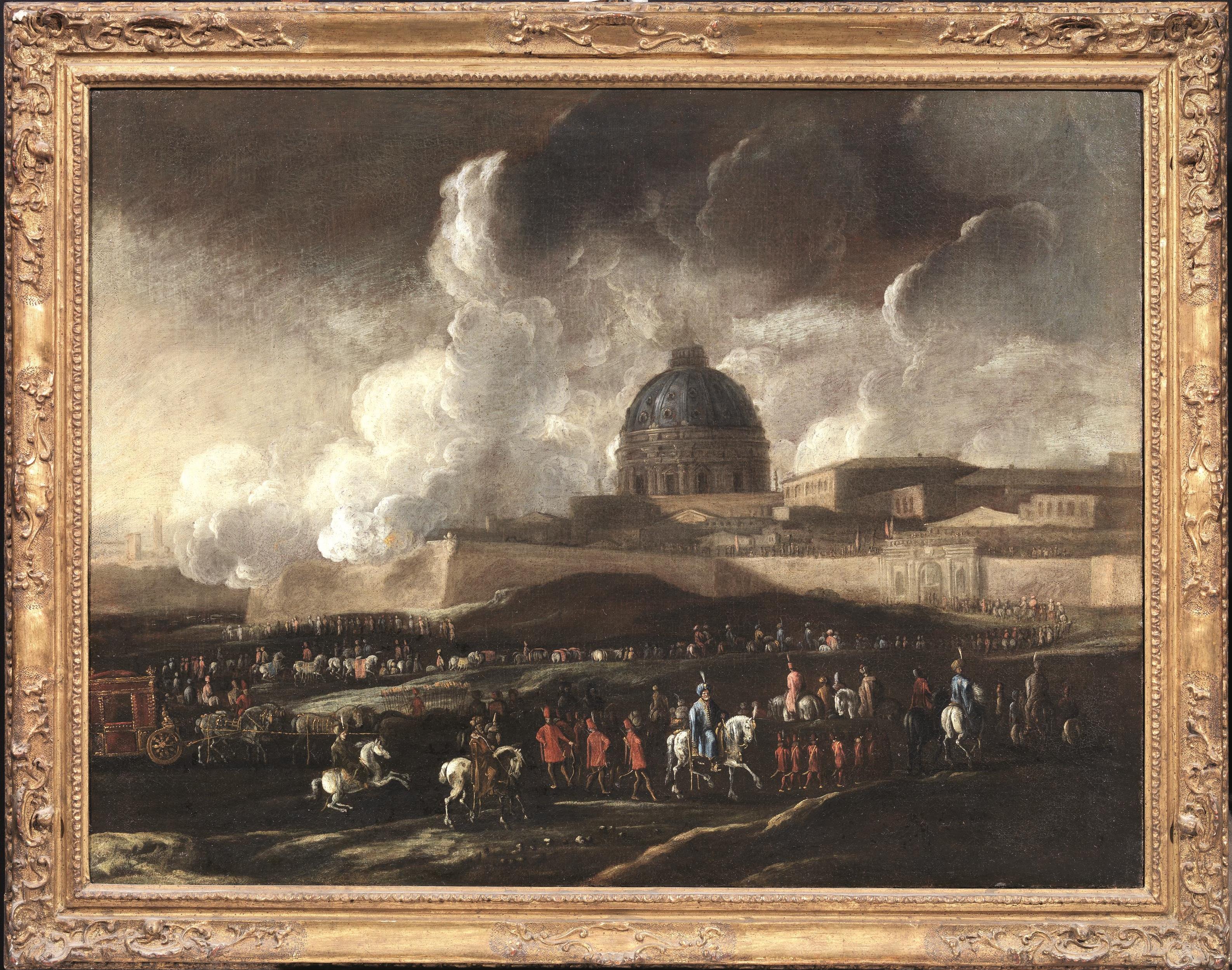 Cerchia di Filippo Napoletano, sec. XVIIPAESAGGIO CON CORTEO E VEDUTA DI...