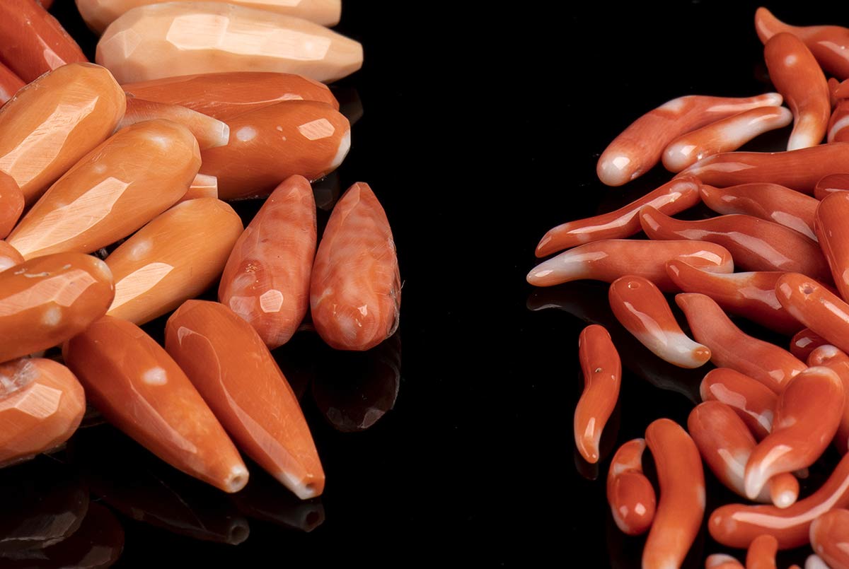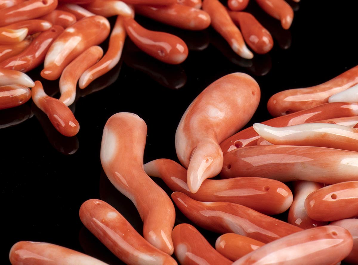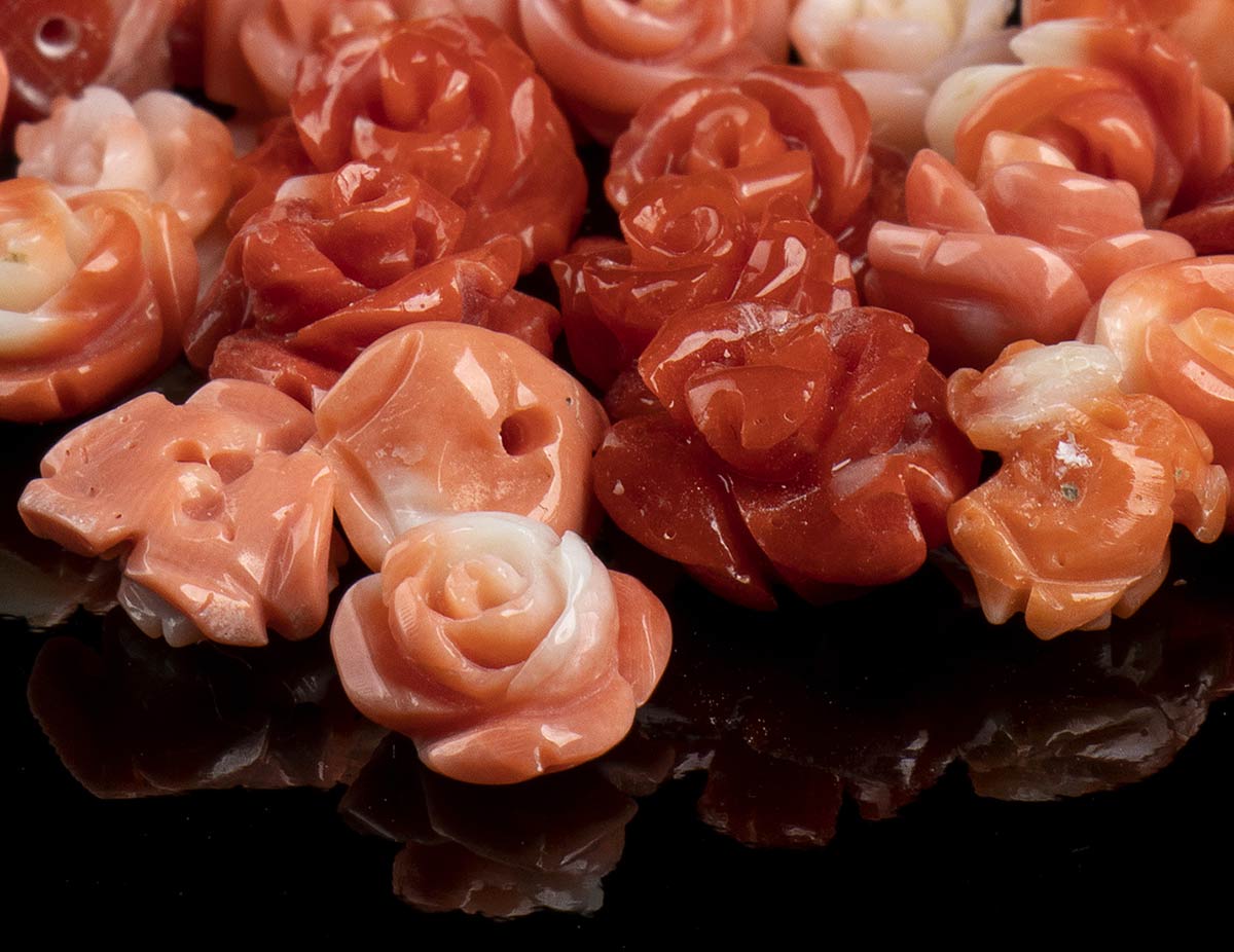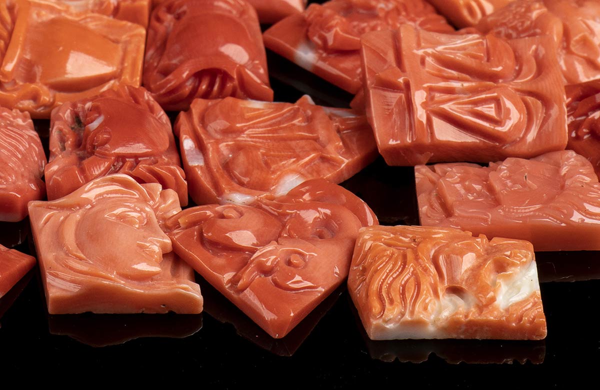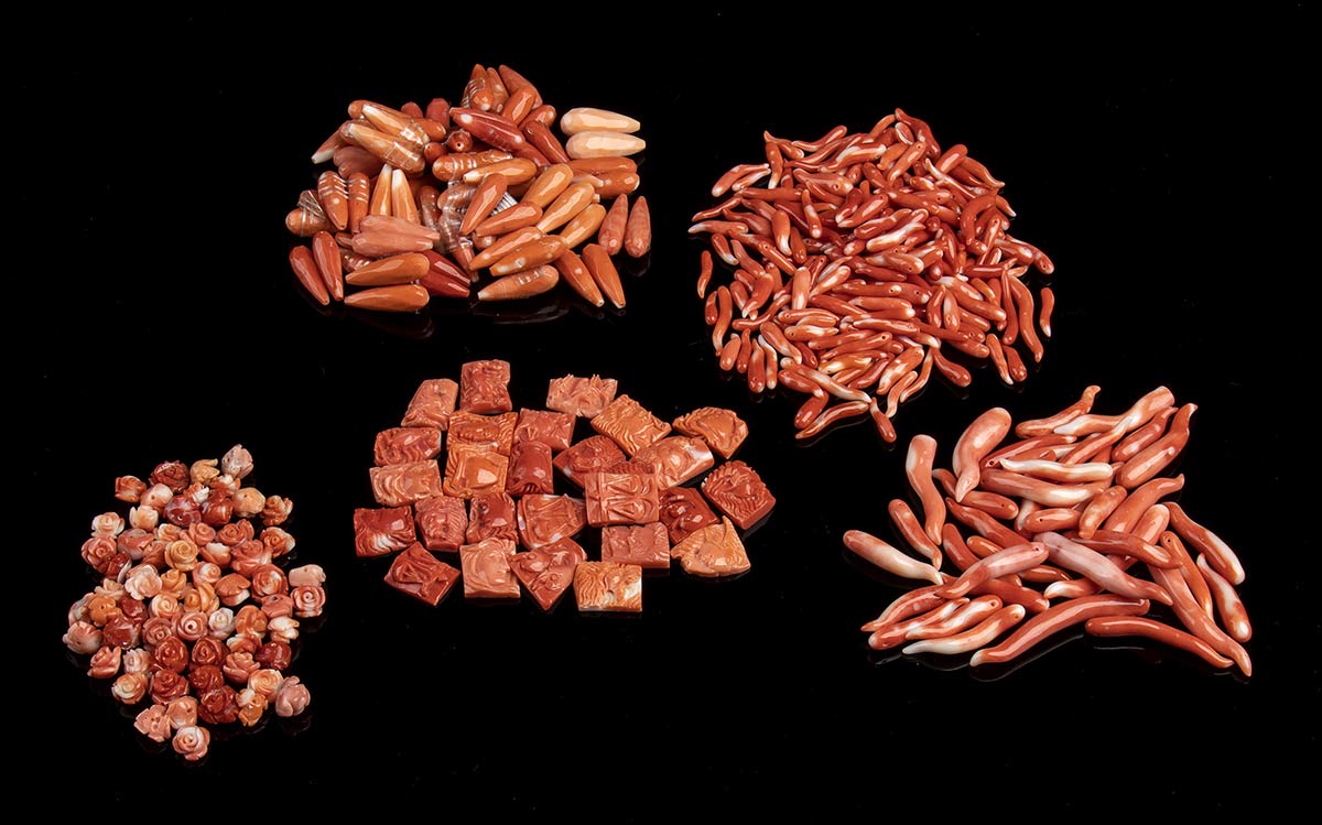 (corallium elatius). Numerosi cornetti in corallium elatius, lunghezza 2-3,5 cm, peso totale 130 gr circa; numerose coppie di gocce sfaccettate, lunghezza 20-30 mm, peso totale 120 gr circa; lotto di intagli di segni zodiacali, peso 43 gr circa; lotto di 31 coppie di fiori, peso 31 gr circa, diametri 7,5-11 mm. Stato di conservazione: ***** eccellente.