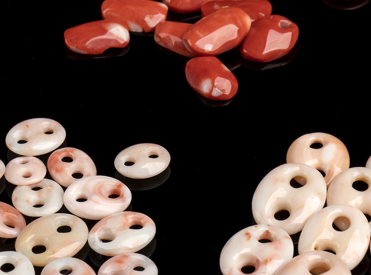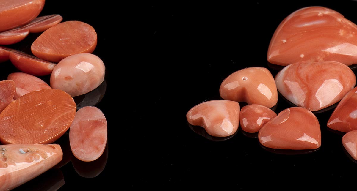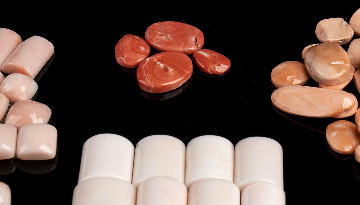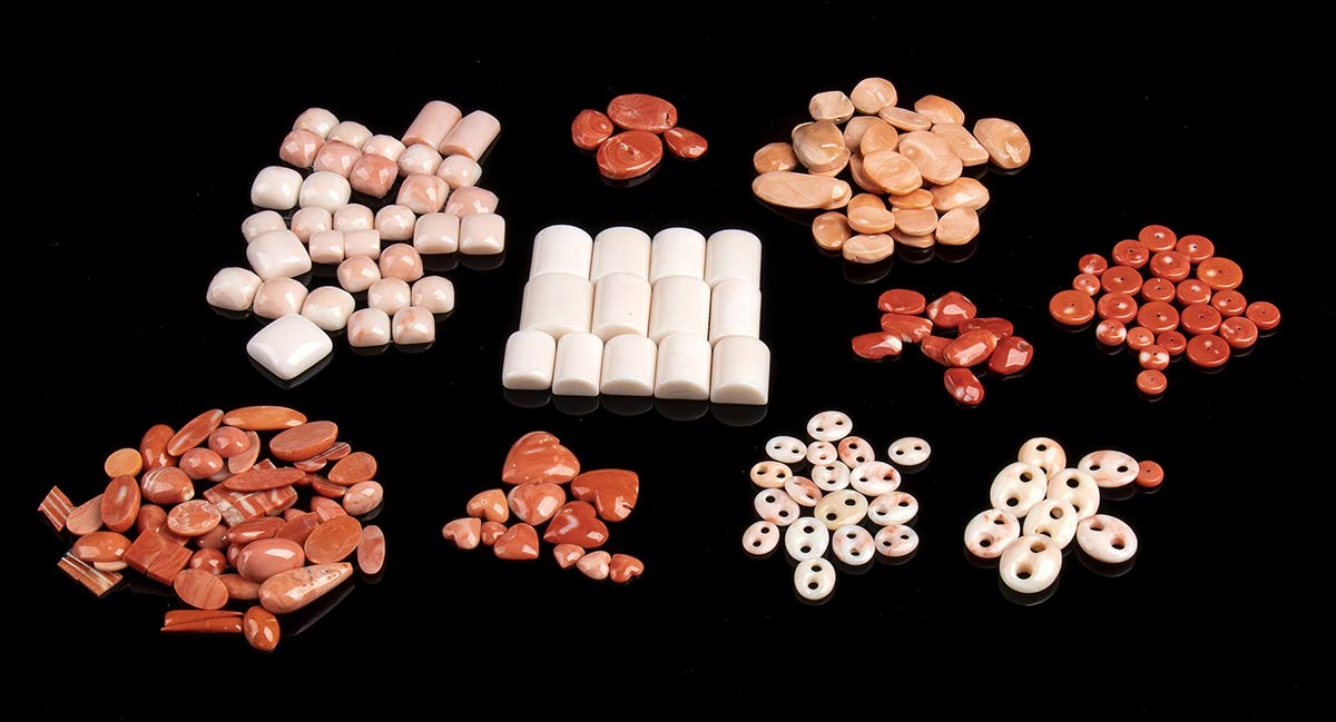 (corallium elatius e corallium secundum). Gocce, cuori, rondelle e cabochon, peso circa 290 gr circa. Stato di conservazione: ***** eccellente.