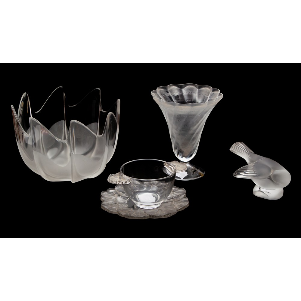 Centrotavola in cristallo Rosenthal, coppa, volatile e coppetta con piattino in cristallo Lalique (sbeccature).
