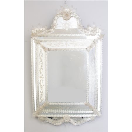 SPECCHIERA in vetro di murano nei toni del trasparente realizzata con elementi a motivo floreali e fogliaceo, vetri incisi.
