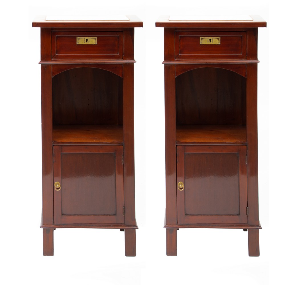 COPPIA COMODINI in legno di mogano con piano in marmo incassato.