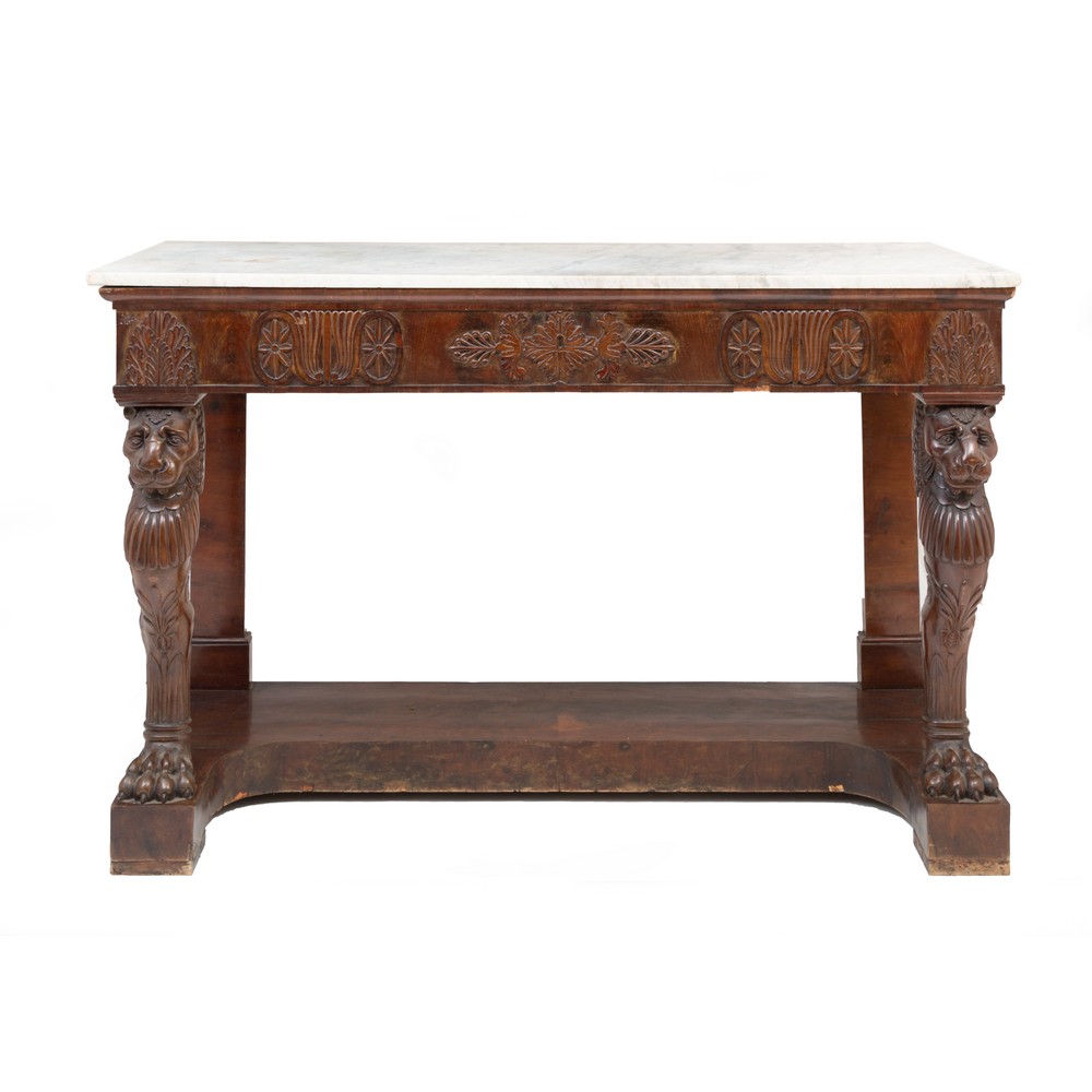 CONSOLLE Impero in mogano e piuma di mogano con piedi raffiguranti figure leonine, piano in marmo bianco di Carrara.