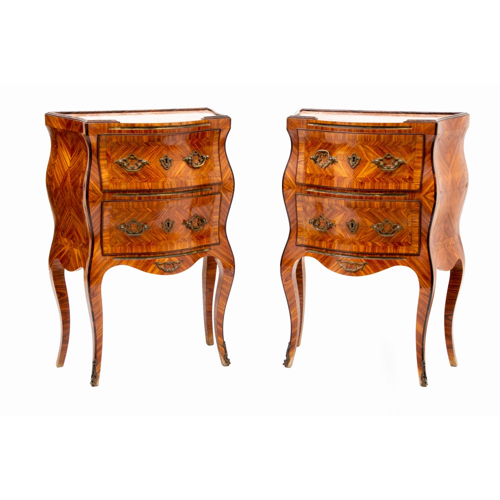 COPPIA COMODINI stile Luigi XV a due cassetti in ebano violetto lavorato a lisca di pesce, piano in marmo diaspro siciliano incassato.
