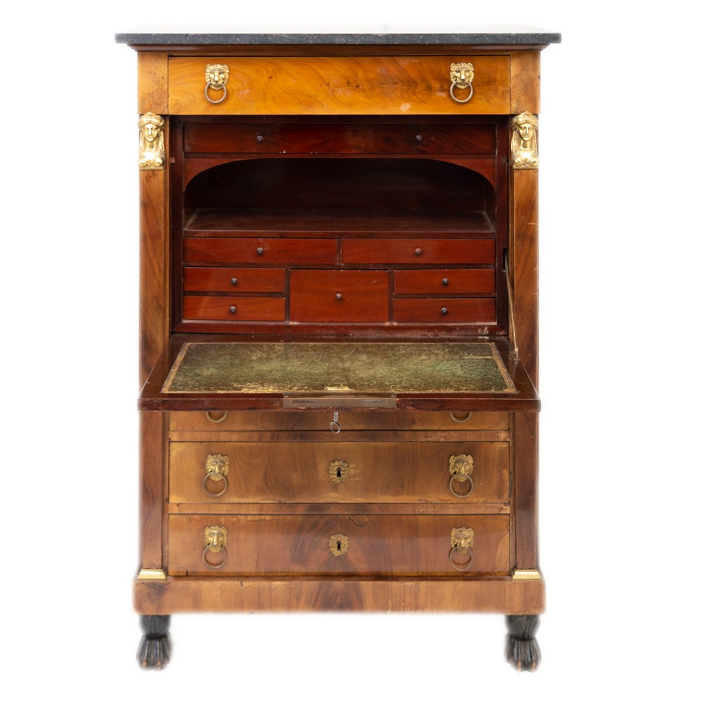 SECRETAIRE tardo Impero in piuma di mogano, guarniture in bronzo, piano in marmo.