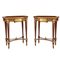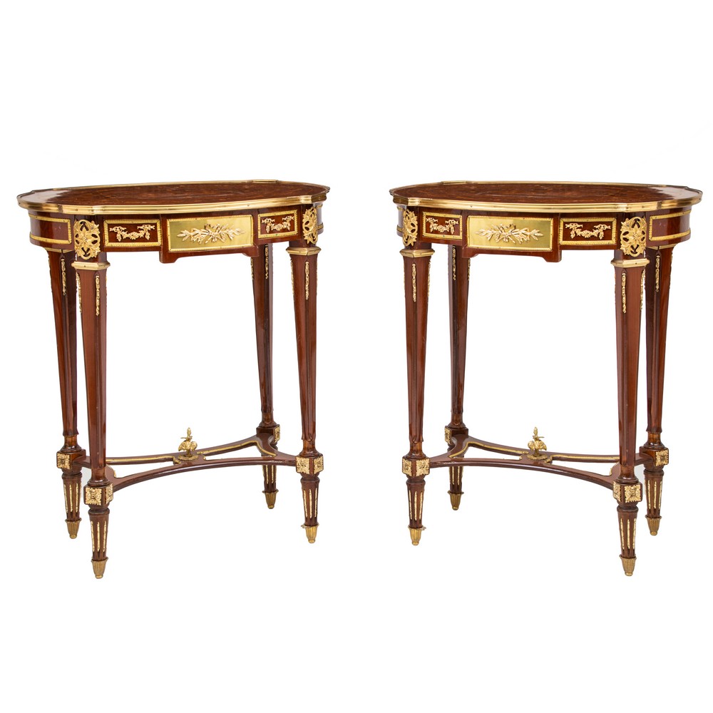 COPPIA TAVOLINI di forma ovale in legno di mogano con applicazioni e fregi in bronzo dorato.