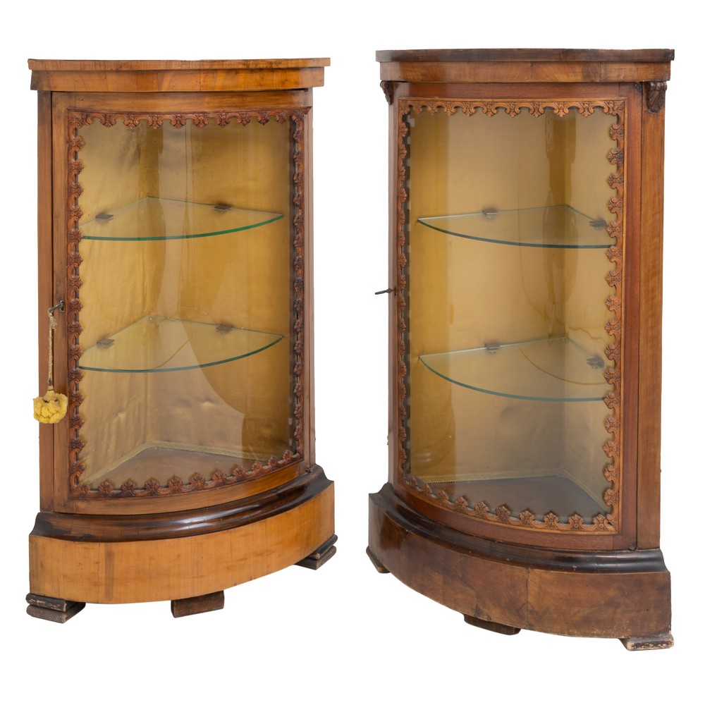 COPPIA DI ANGOLIERE in legno di noce con vetri bombati.