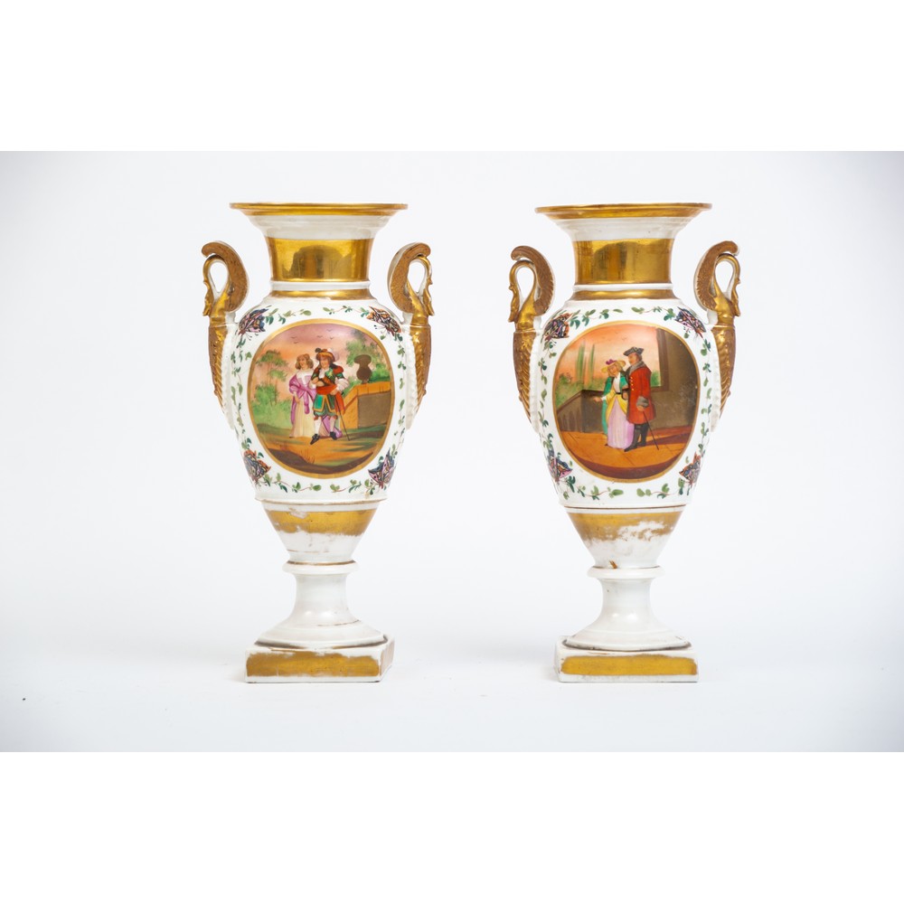 COPPIA VASI Impero in porcellana bianca decorata con medaglioni raffigurante "Personaggi" (usure).