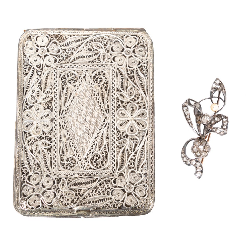 Spilla in oro 9 KT e argento con diamanti ct. 0,40 peso di stima e micro perlina (g. 5,90) (mancanza) e portabiglietti in filigrana d' argento a motivo floreale (g. 66) (rottura).