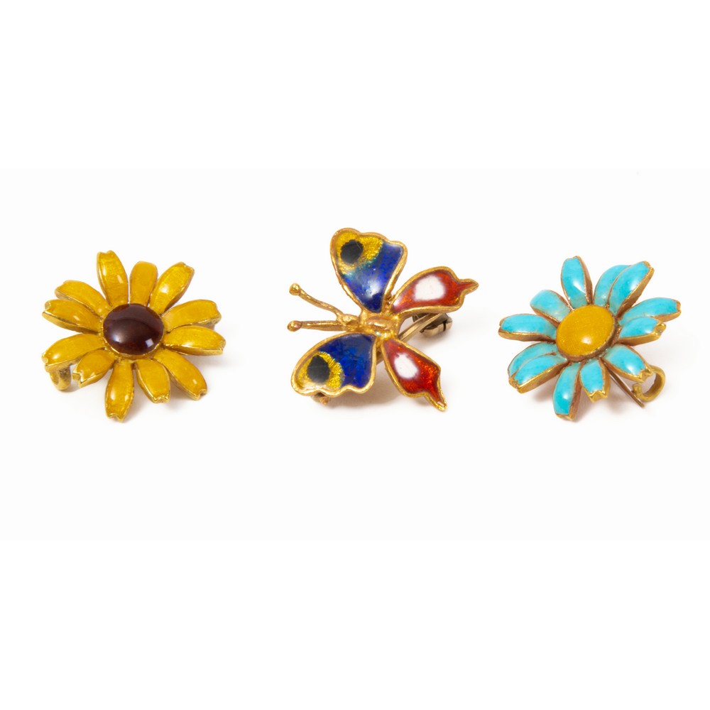 TRE SPILLE in oro giallo 18 KT e smalti (g. 7,10).