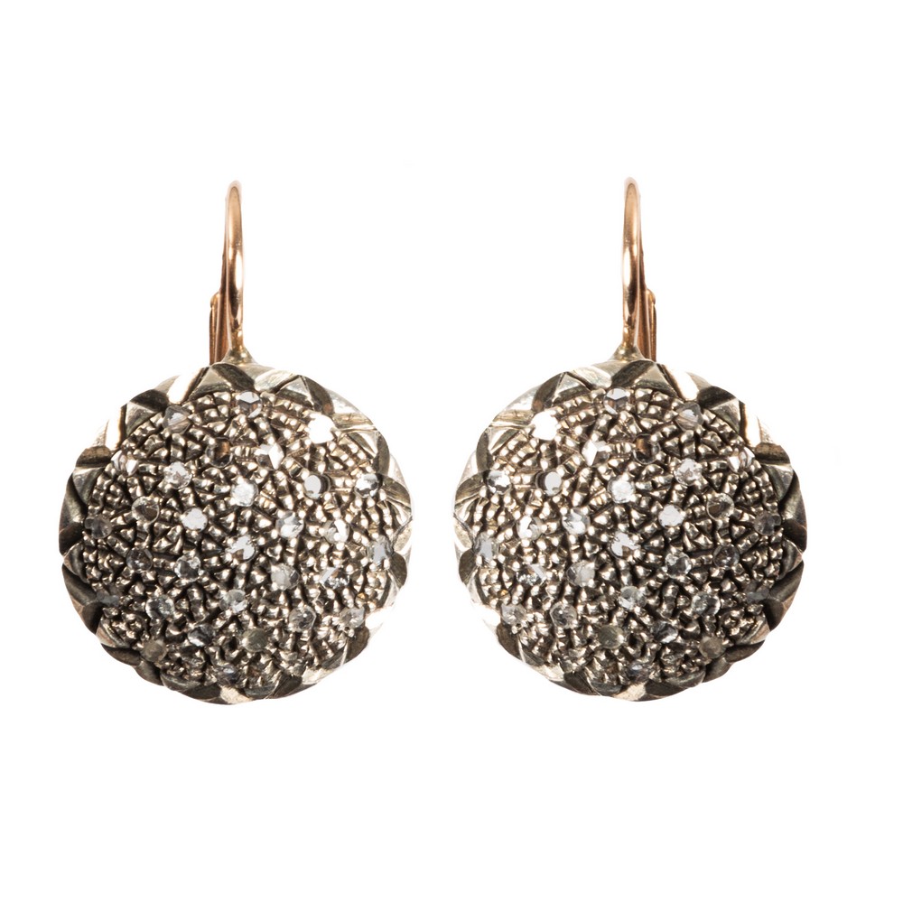 ORECCHINI a toppa in oro giallo 9 KT e argento con diamanti ct. 0,60 peso di stima (g. 11,60).