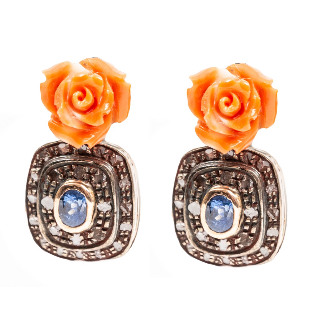 ORECCHINI in oro giallo 12 KT e argento con diamanti ct. 0,20 peso di stima, zaffiri ct. 0,30 peso di stima e rose di corallo (g. 17,40).