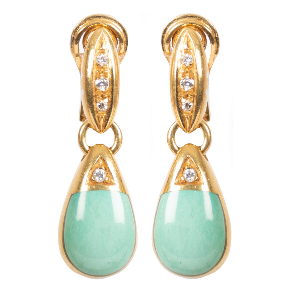 ORECCHINI in oro giallo 18 KT con diamanti taglio huit/huit ct. 0,10 e turchesi (g. 14,30).