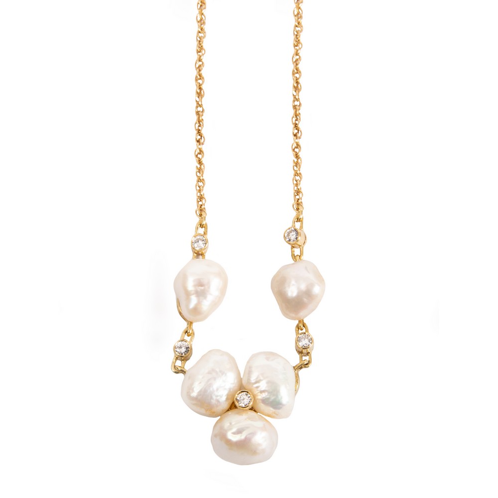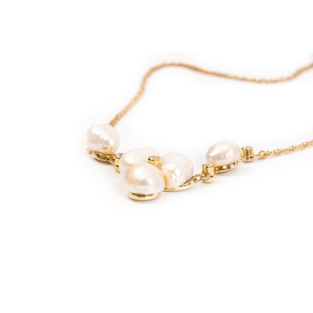 COLLANA in oro giallo 18 KT con diamanti taglio brillante ct. 0,20 H color VVS2 e perle senza nucleo (g. 15,80).