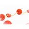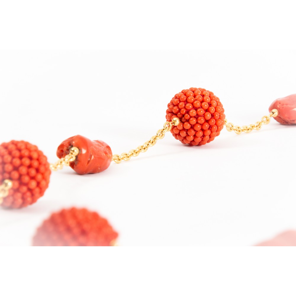 COLLANA in oro giallo 18 KT con cinque sfere in corallo tessito e sei sassi in corallo (g. 98,80).