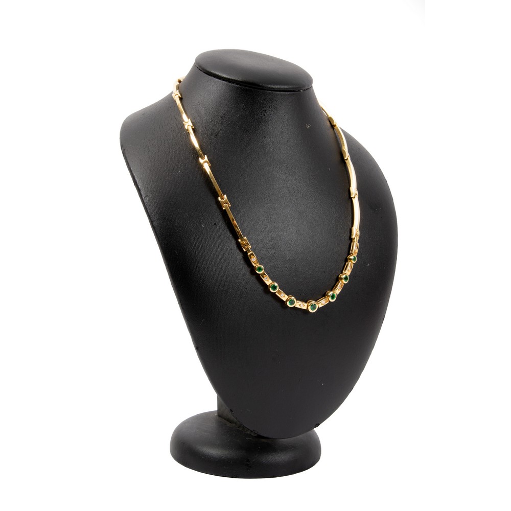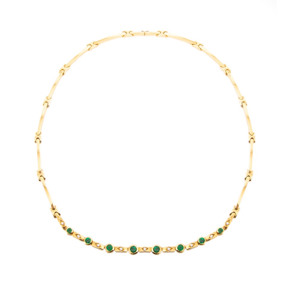 COLLANA Damiani in oro giallo 18 KT con diamanti taglio brillante ct. 0,12 H color VVS1 e smeraldi ct. 0,70 (g. 40,10).