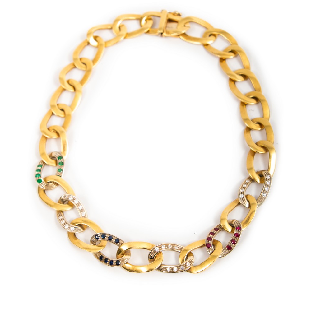 COLLANA in oro giallo 18 KT con diamanti taglio huit/huit ct. 0,20 peso di stima, rubini ct. 0,16 peso di stima, zaffiri ct. 0,16 peso di stima e smeraldi ct. 0,20 peso di stima (g. 92,40).