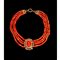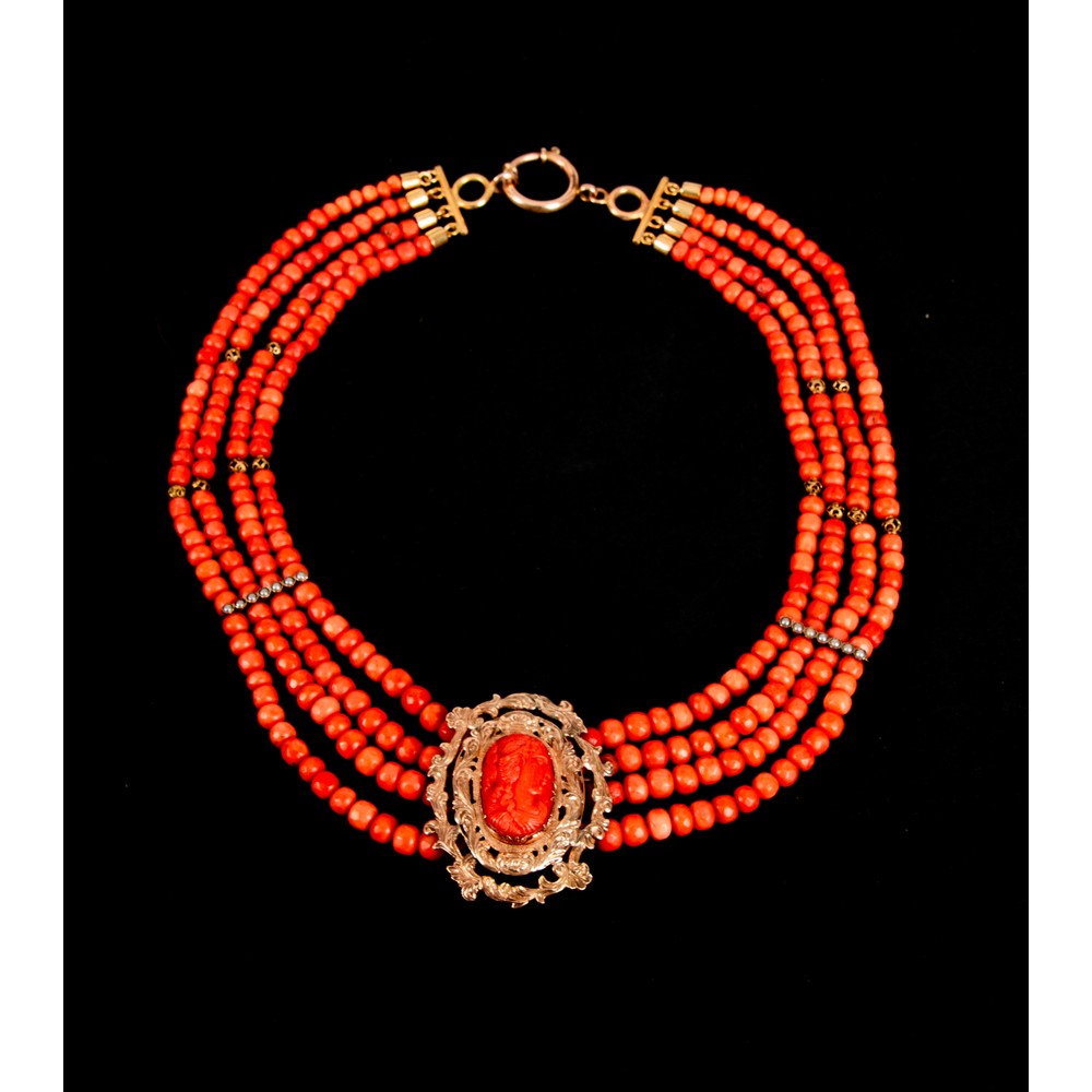 COLLANA a quattro fili di corallo rosso con medaglione centrale in oro giallo 9 KT e corallo lavorato raffigurante "Mezzobusto figura femminile", susta e divisori in oro giallo 9 KT, terminali in oro giallo 18 KT e microperline argentate (g. 100,20).