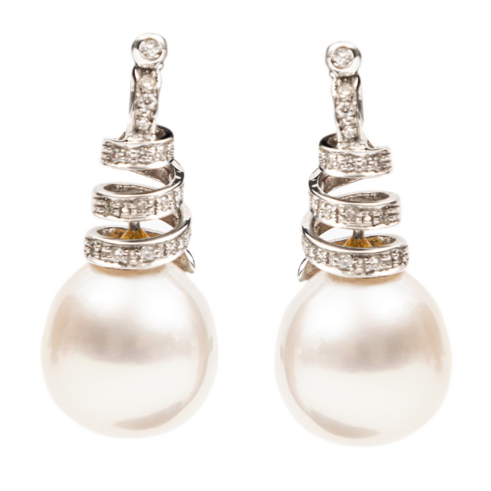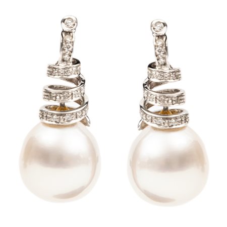 ORECCHINI in oro bianco 18 KT con diamanti taglio brillanti I color SI2 ct. 0,30 peso di stima e perle australiane (g. 15,30).