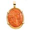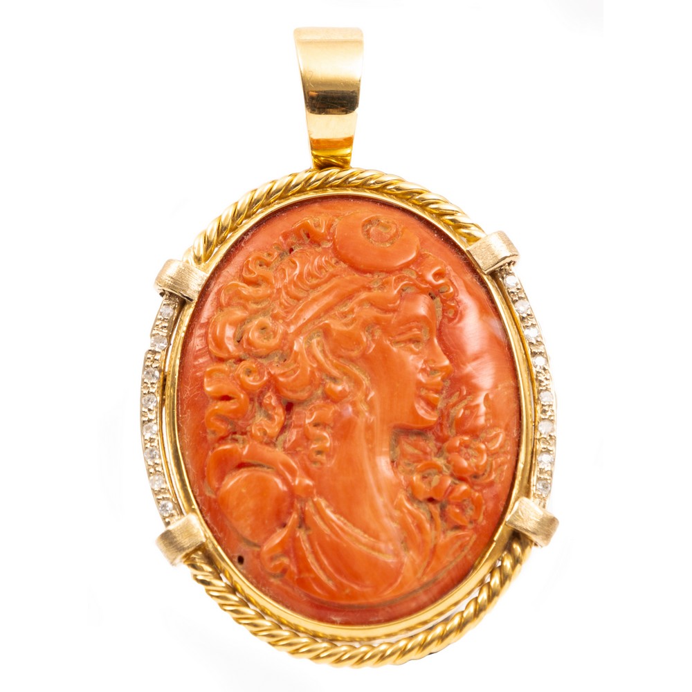 CIONDOLO/SPILLA in corallo scolpito raffigurante "Profilo di gentildonna", montatura in oro giallo 18 KT con diamanti taglio huit/huit ct. 0,10 peso di stima (g. 17,20).