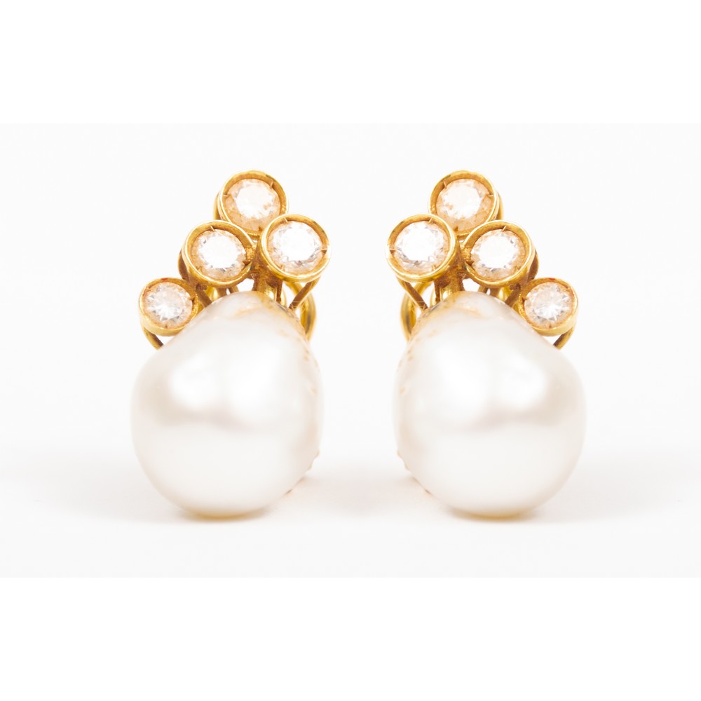ORECCHINI in oro giallo 18 KT con diamanti taglio brillante ct. 0,70 H color VS1 e perle coltivate australiane ct. 30,00 peso di stima (g. 14,60).