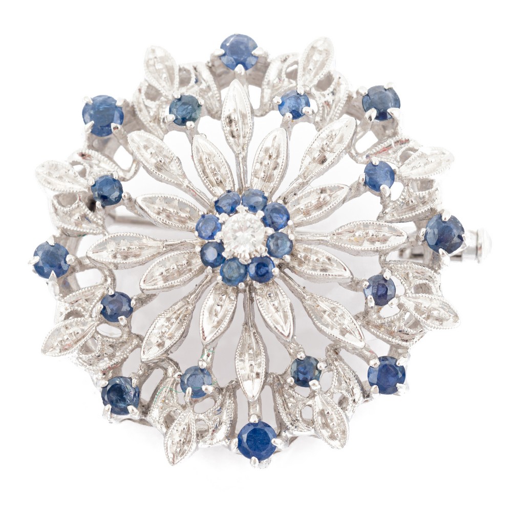 Lotto 369 | SPILLA in oro bianco 18 KT con zaffiri e brillante