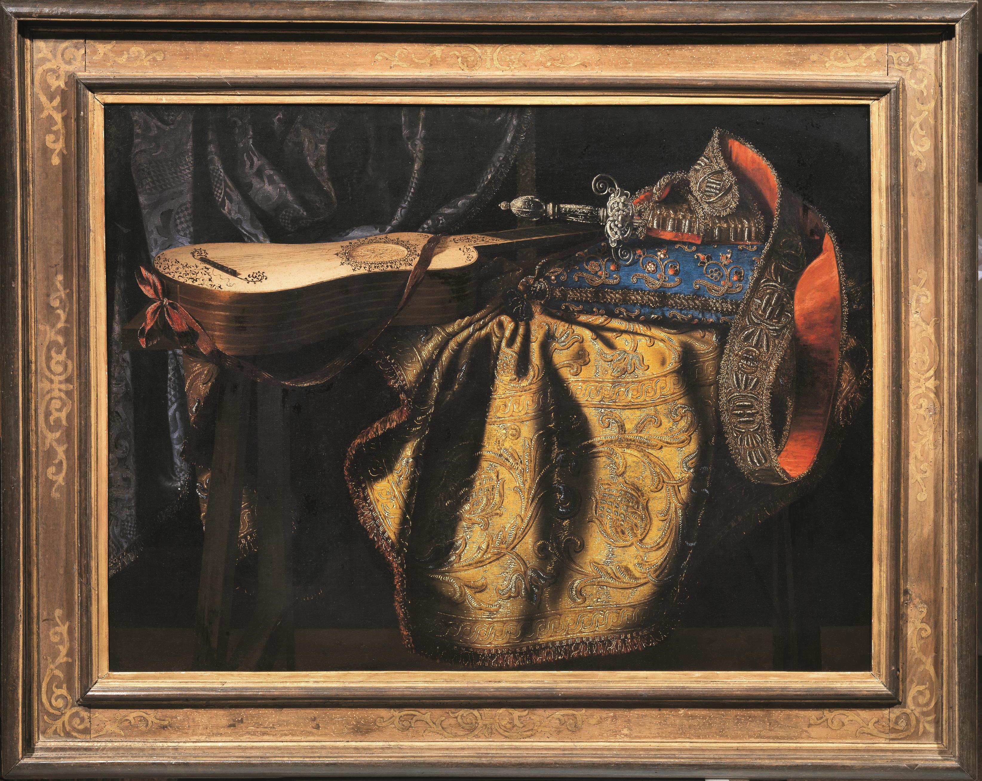 NATURA MORTA CON TAPPETO, CUSCINO, CHITARRA E SPADA