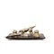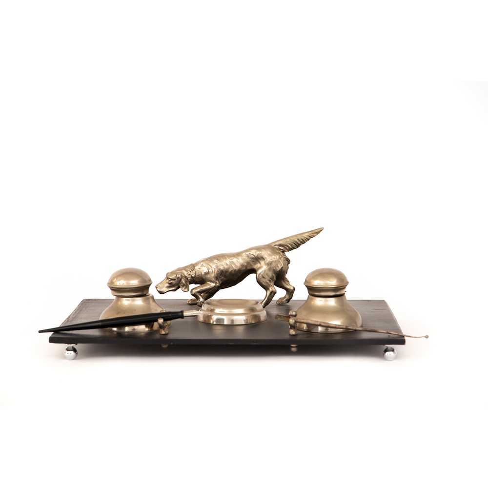 CALAMAIO in metallo argentato su base in legno e scultura "Cane da caccia".