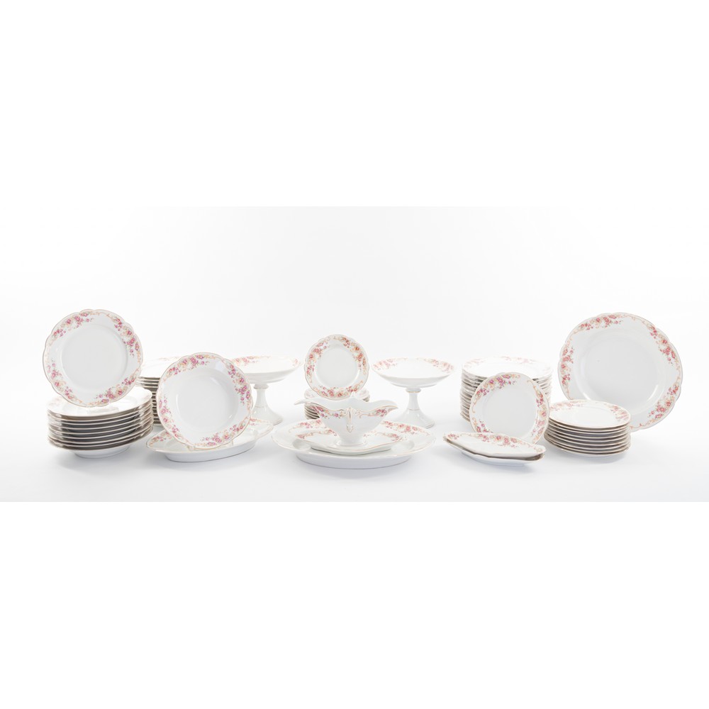 SERVIZIO DI PIATTI in porcellana decorata a motivo floreale composto da 30 piatti piani, 10 fondi, 9 dolce, 2 alzate, 2 piatti ovali, salsiera con mestolo, piatto tondo e 2 raviere (un piatto piano sbeccato).