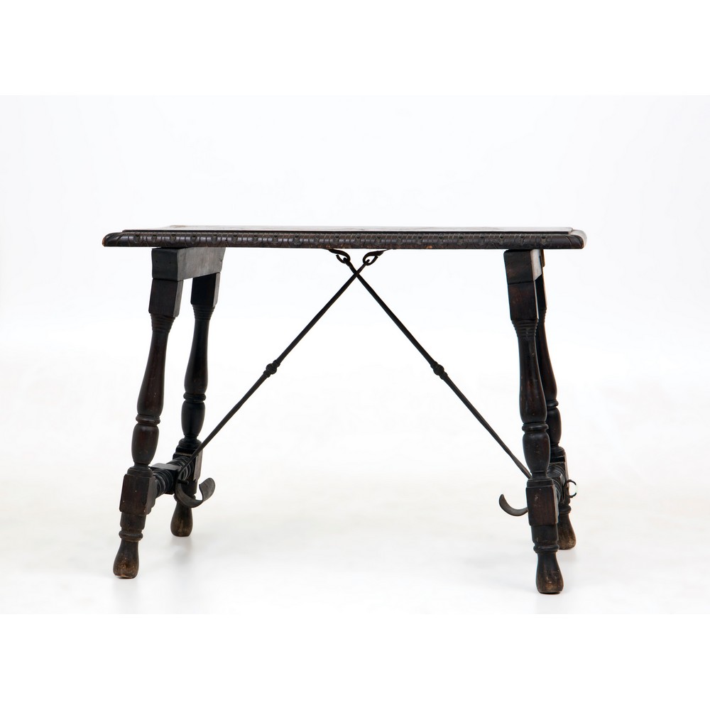 TAVOLINO a capretta di gusto rinascimentale in legno di noce.