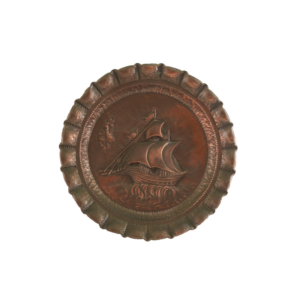 PIATTO da parata di forma circolare in rame cesellato e sbalzato raffigurante "Veliero".