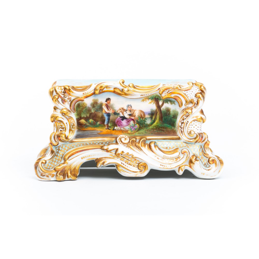 dipinta con lumeggiature in oro e decoro centrale raffigurante "Scena galante".