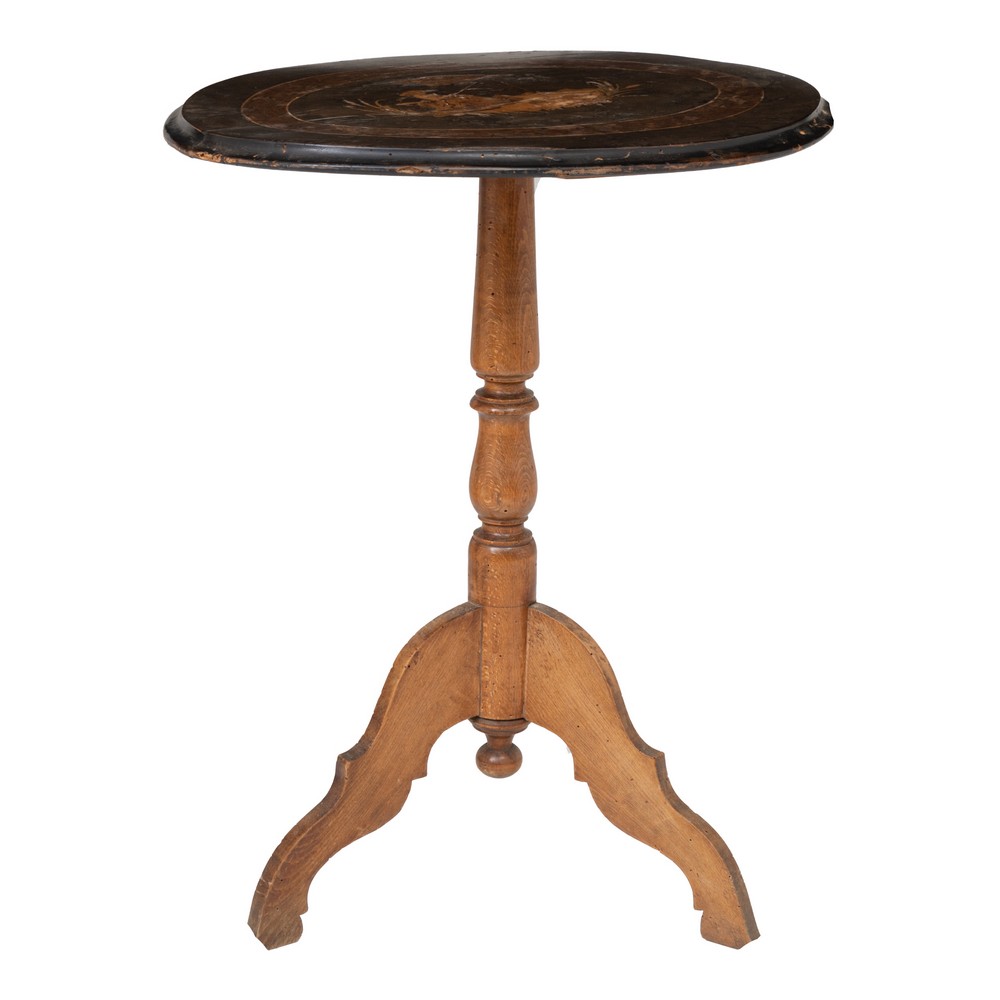 TAVOLINO di forma ovale in legno di palissandro, noce, radica di tuja con tarsie in bosso.