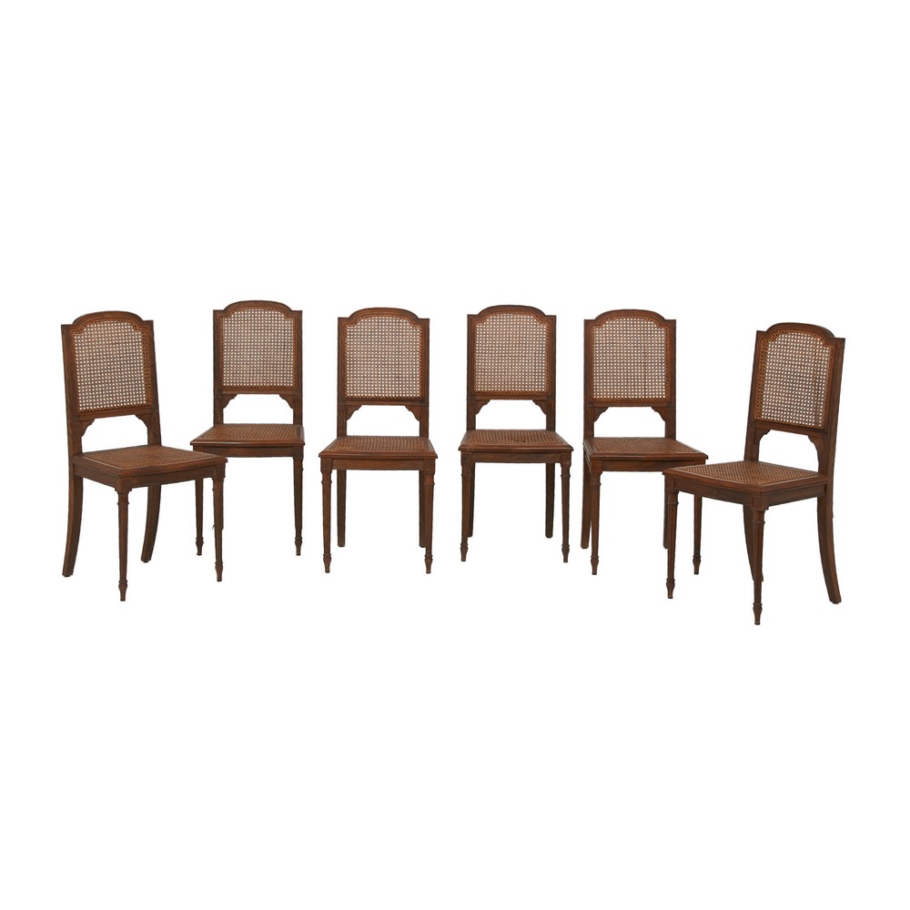 SEI SEDIE in legno di noce con seduta e spalliera in finocchino (una seduta da rifare).