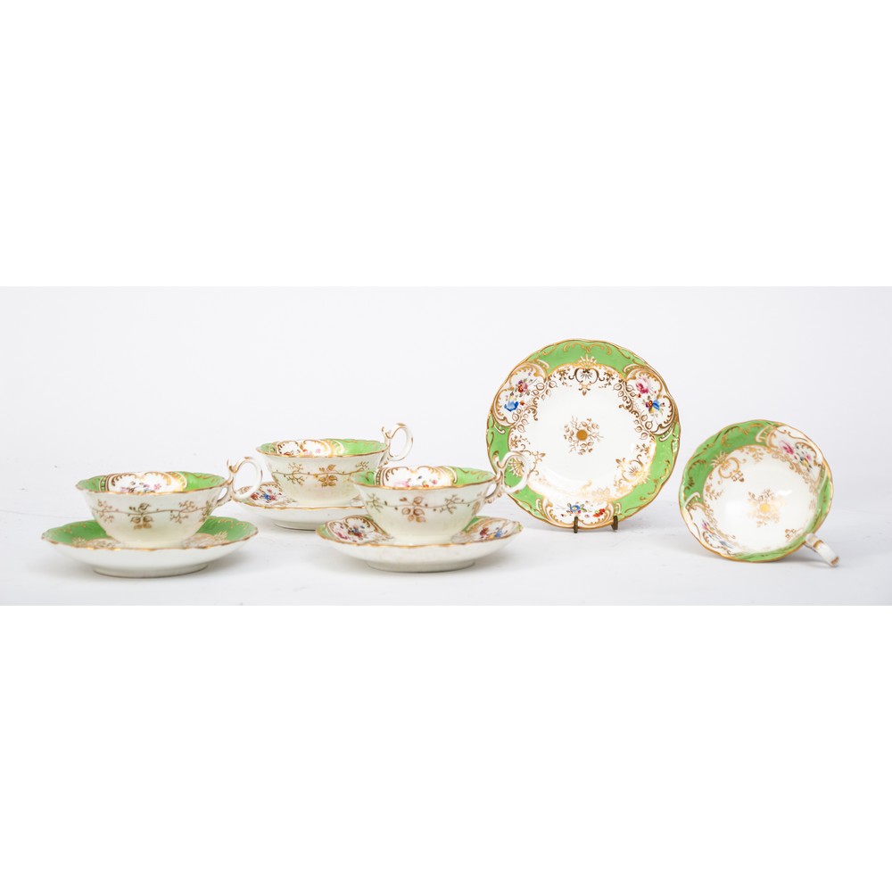 QUATTRO TAZZE con piattini in porcellana dipinta a mano, lumeggiature in oro, marchi alla base.
