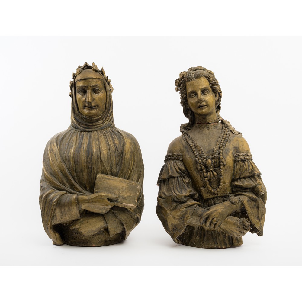 COPPIA SCULTURE in terracotta laccata raffiguranti "Dante" e "Beatrice" (rotture e usure).