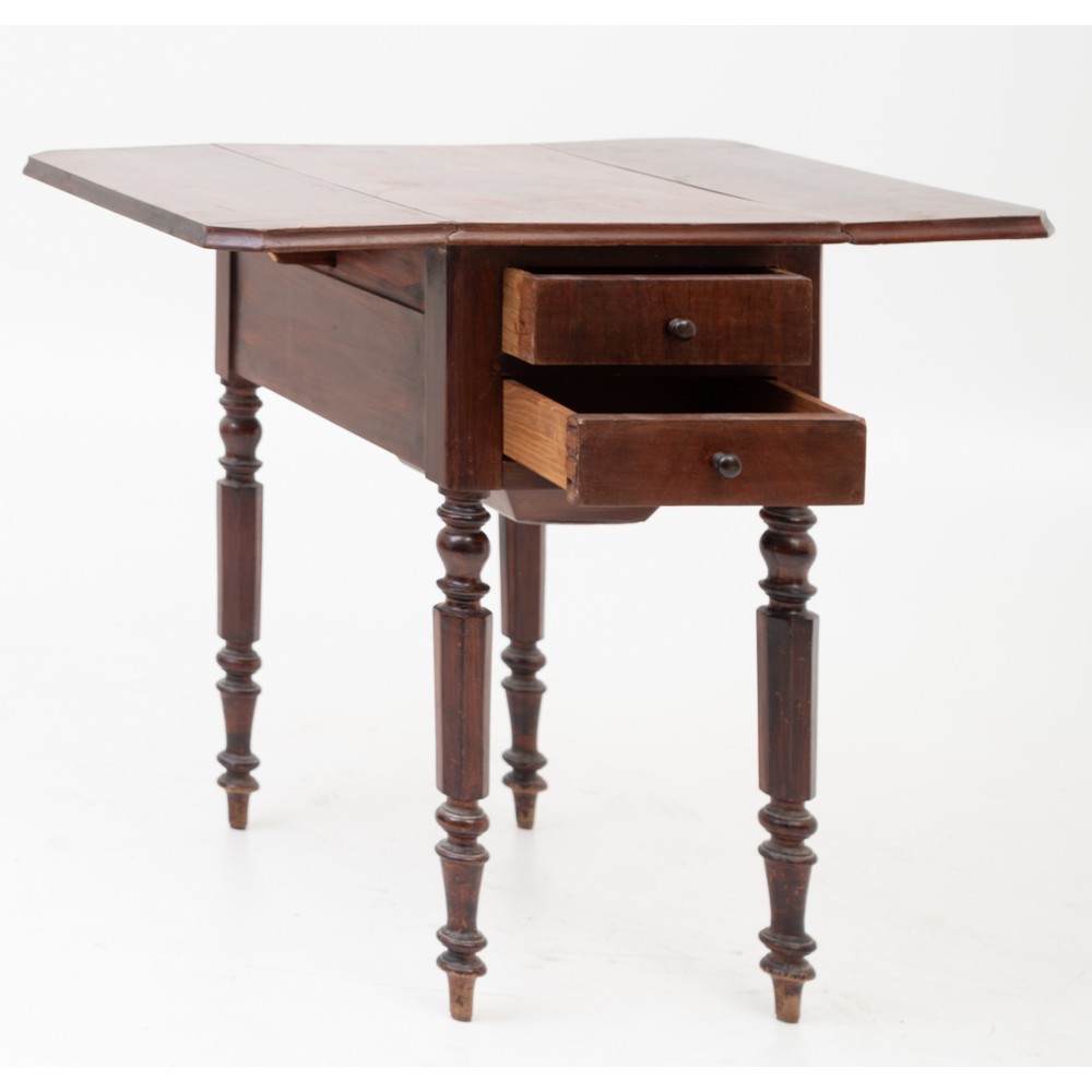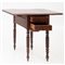 TAVOLINO con alette in mogano e piuma di mogano con un' anta ed un cassetto.