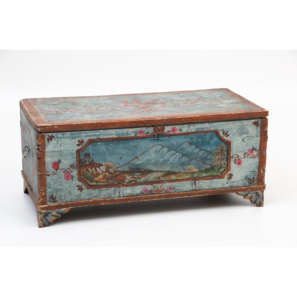 CASSA in legno dipinto e laccato raffigurante un paesaggio.