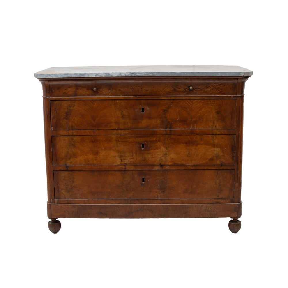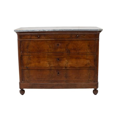 CASSETTONE a quattro cassetti in mogano e piuma di mogano con piano in marmo grigio.