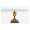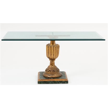 TAVOLINO da salotto con base in legno decorata a finto marmo, fusto dorato e piano in vetro.
