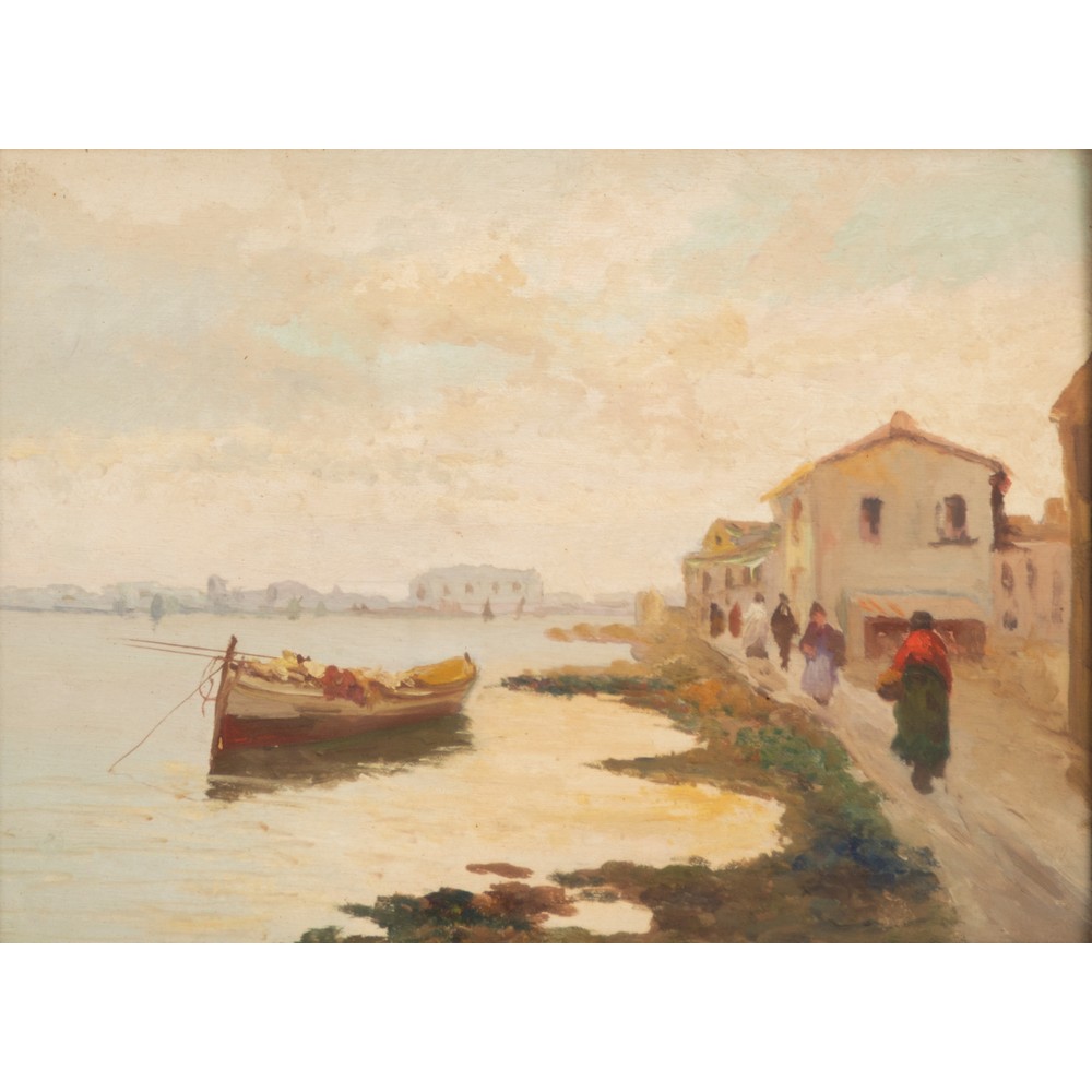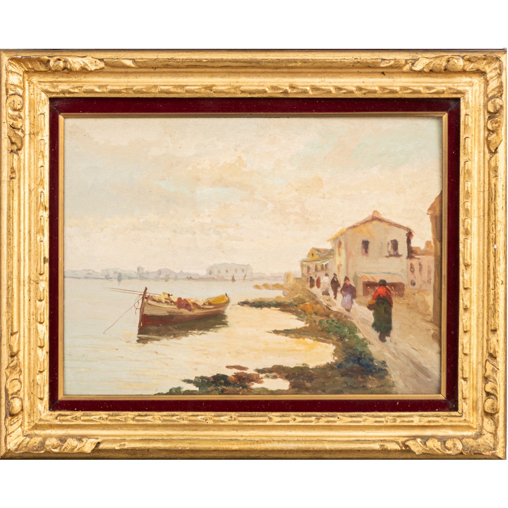 PITTORE DEL XX SECOLO, Marina con barche, Olio su tavoletta