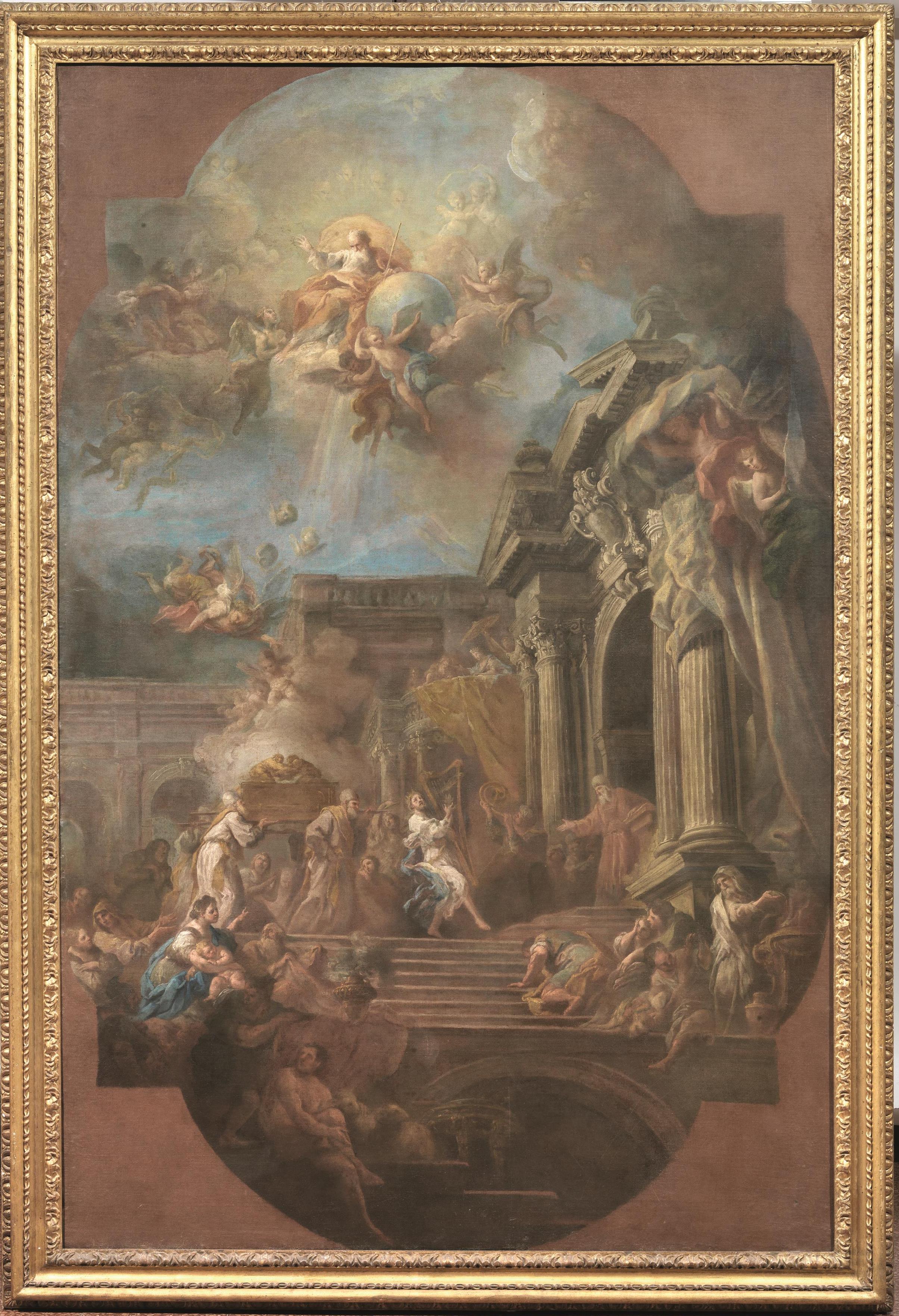 L’importante decorazione, iniziata nel 1752 e documentata da pagamenti per un totale di ben 2.000 ducati, comprendeva anche figure allegoriche nel presbiterio e l’affresco, eseguito nel 1754, raffigurante Salomone che riceve la regina di Saba. Anch’esso distrutto, è però documentato dal bozzetto preparatorio venduto da Christie’s a Milano il 25 maggio 2011 (lotto n. 56). Come la tela qui presentata, lo studio in questione iscrive la composizione in una cornice mistilinea, oltre la quale è in vista la preparazione rosata dello sfondo.