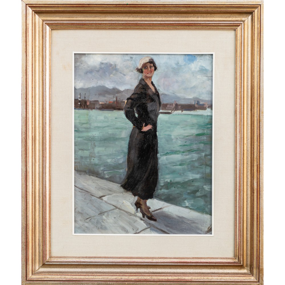 PITTORE DEL XX SECOLO, Paesaggio marino con figura femminile