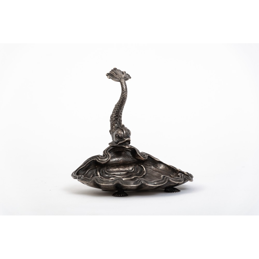 SVUOTATASCHE in argento a guisa di fontana con delfino. Argentiere Caputo Francesco - Milano (g. 622).