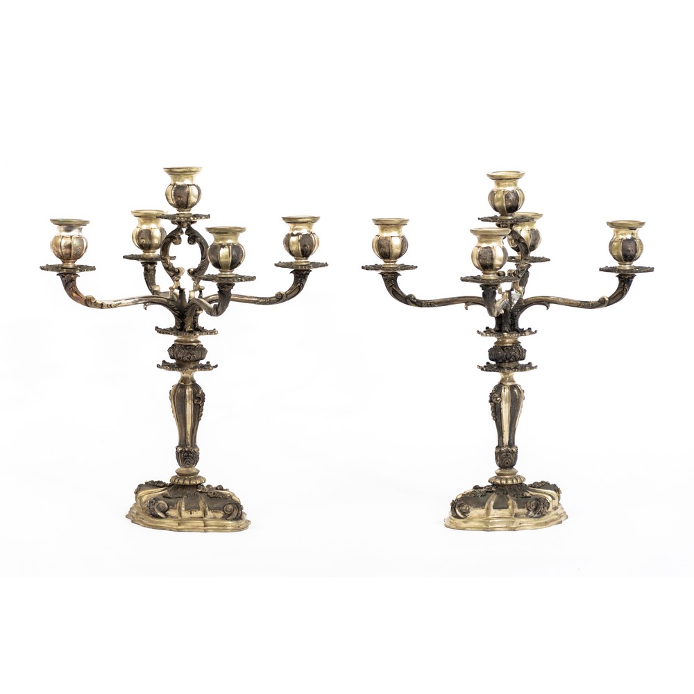 COPPIA CANDELABRI di gusto barocco a cinque fiamme in argento sbalzato. Argentiere Scanabissi Bruno - Bologna (g. 4.575).