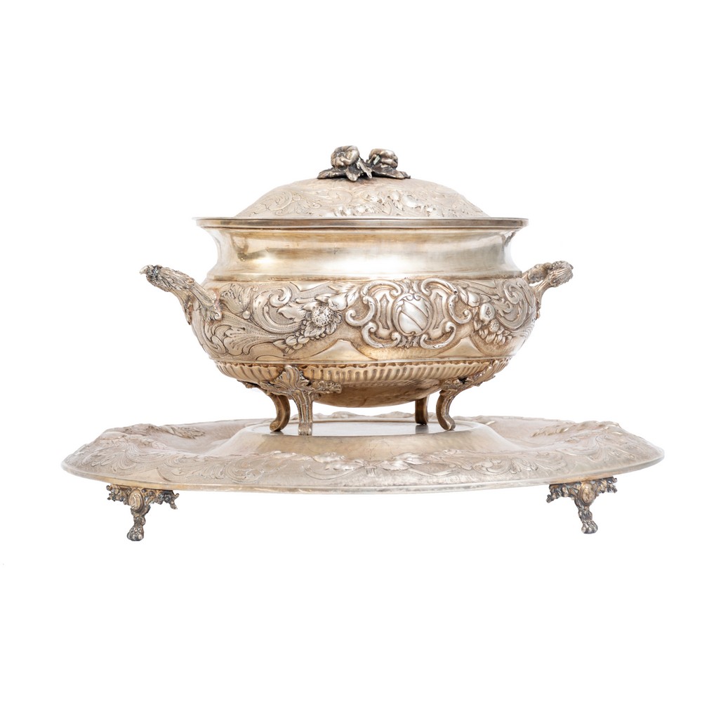 GRANDE ZUPPIERA con base in argento riccamente sbalzata a motivo naturalistico. Argentiere G. Foglia - Firenze (g. 6.830).