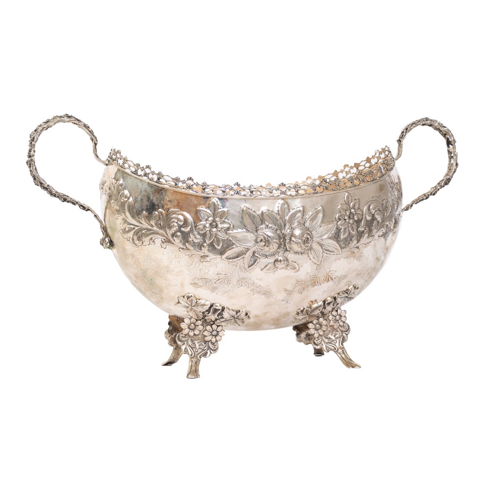 GRANDE CENTROTAVOLA in argento riccamente sbalzato a mano a motivo floreale e fogliaceo (g. 6.840).