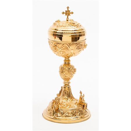 IMPORTANTE CALICE in argento riccamente sbalzato a mano con raffigurazione di putti, coppa in argento vermeil.