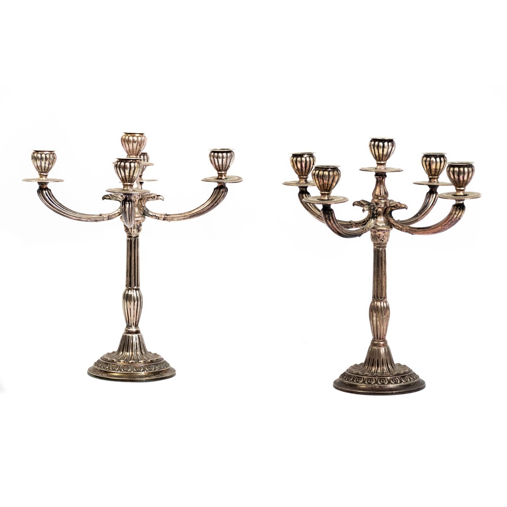 COPPIA CANDELABRI stile Impero a cinque fiamme in argento. Argentiere A.P.I.S - Palermo (g. 793).